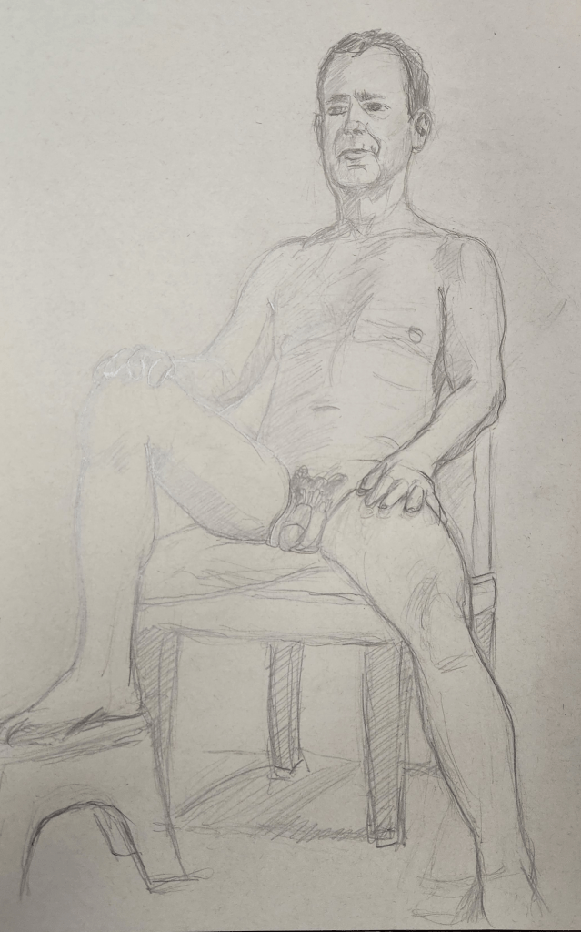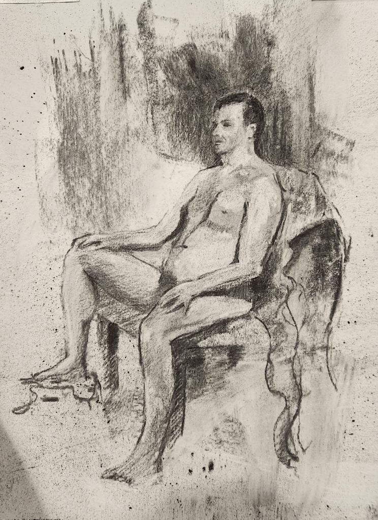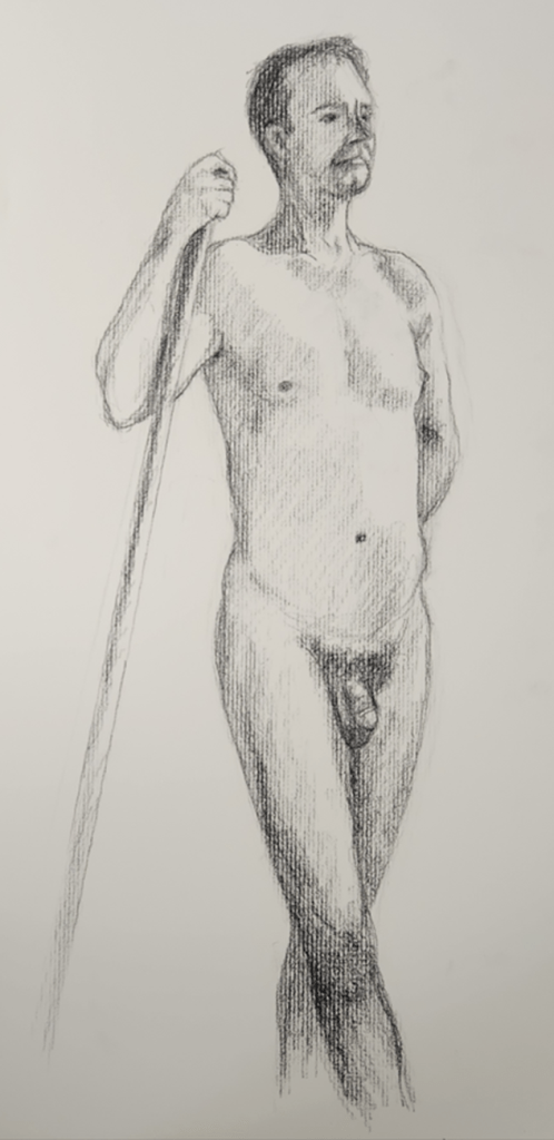 I used a rope, looped around one leg of the model stand, for the first 3-minute pose, leaning back and pulling hard, then did two more 3-minute poses (one crouching, one standing and twisting, aiming my imaginary bow and arrow at some imaginary target beneath me), before switching to the long pose. The long pose was the most relaxing I’ve ever done, seated in a cushy chair, one foot on a step stool: