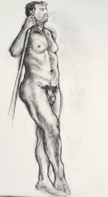 I modeled last night for the wonderful St Paul Old Town Artists group. It was a hot night (91F), and a small group (just 5 in attendance), but the art was fantastic, and the artists friendly and interesting as always. The 2-hour session started with three 3-minute poses, followed by a single pose held the rest of the night, in 22-minute intervals, with 8-minute breaks.
